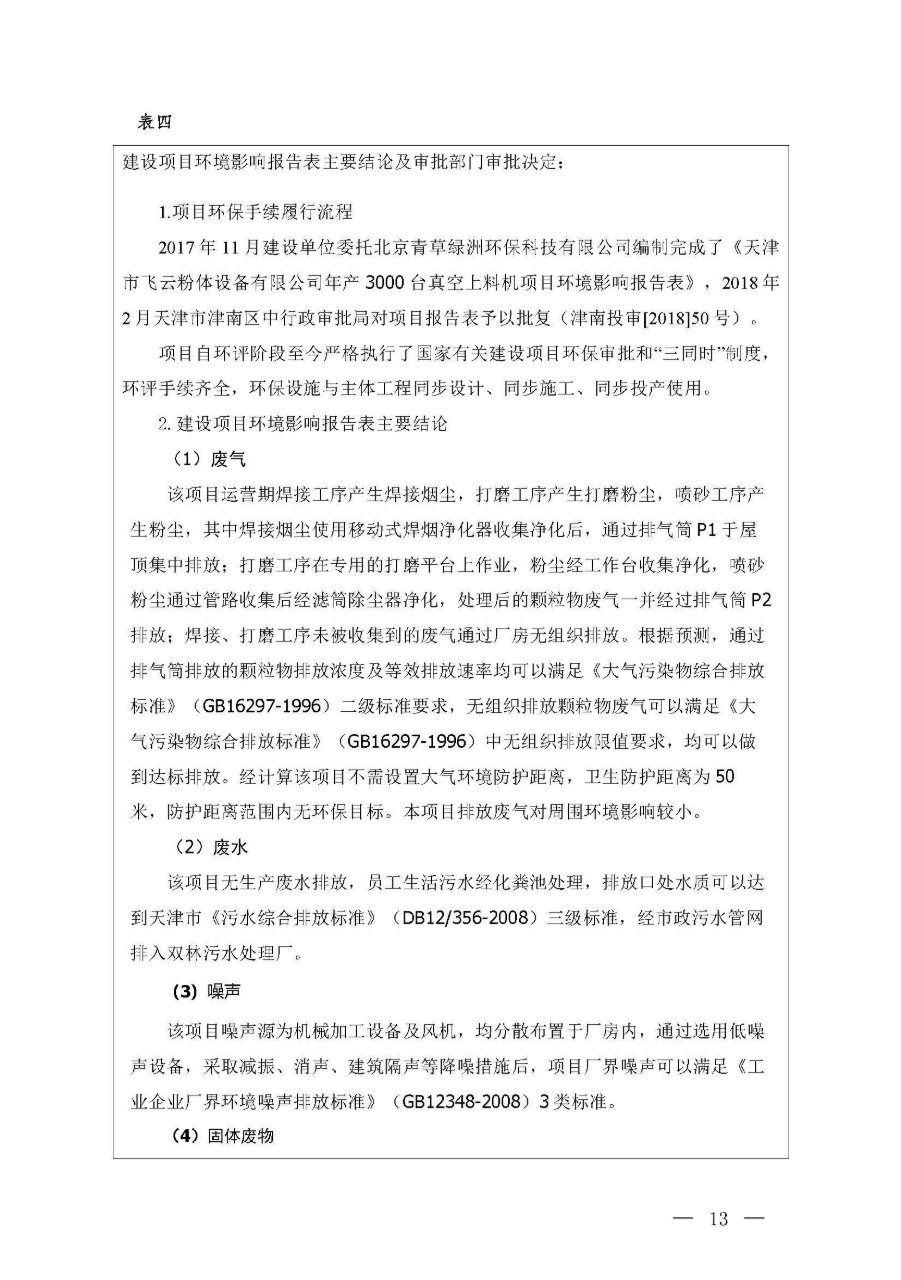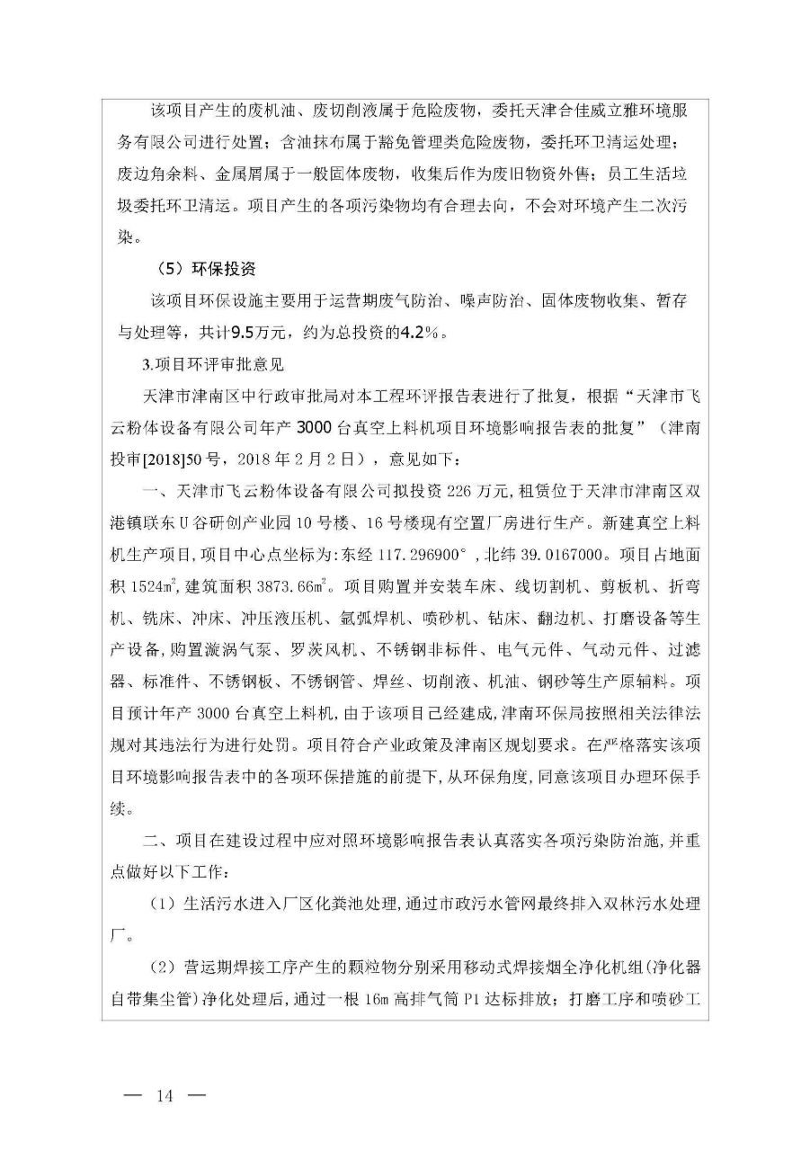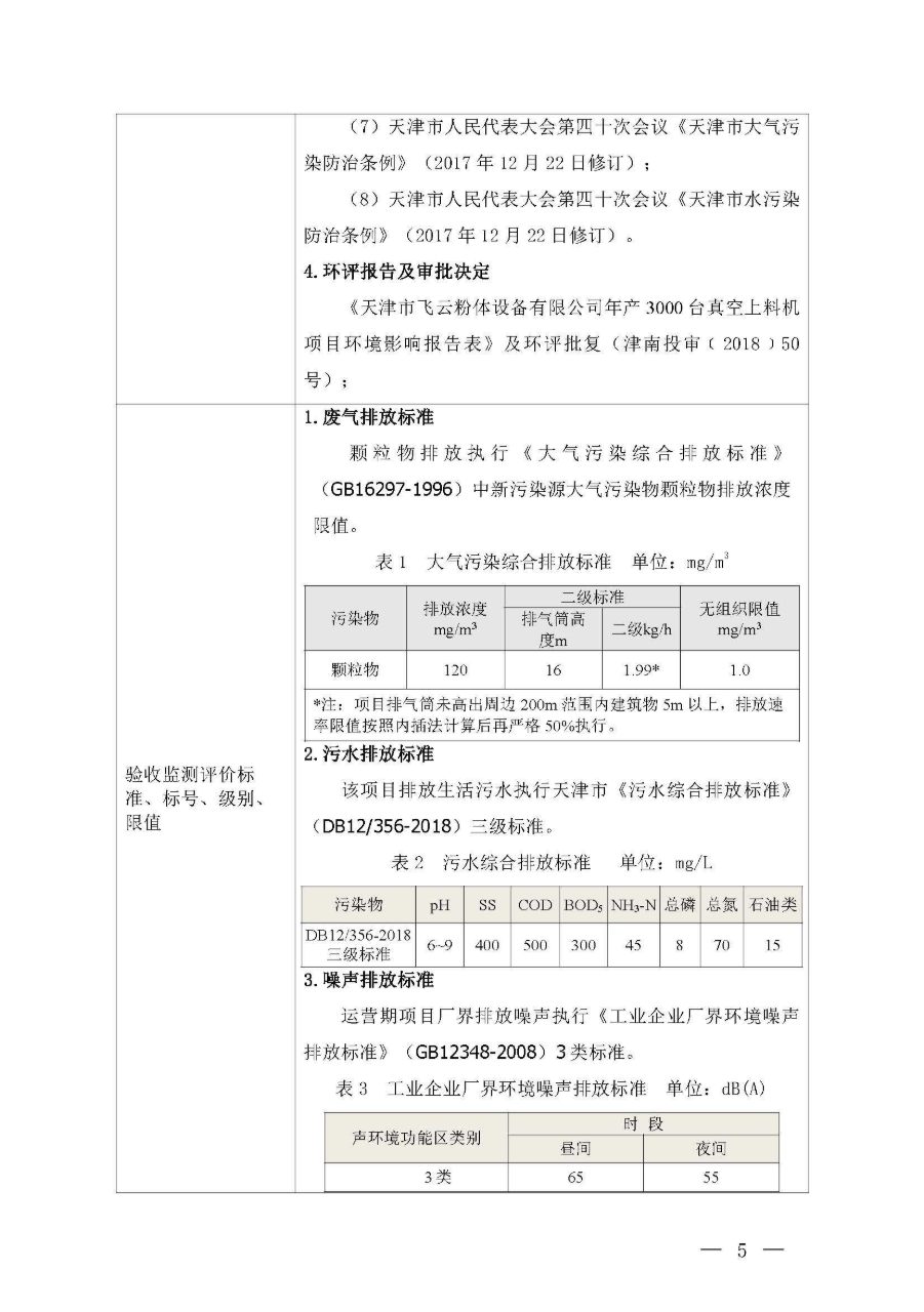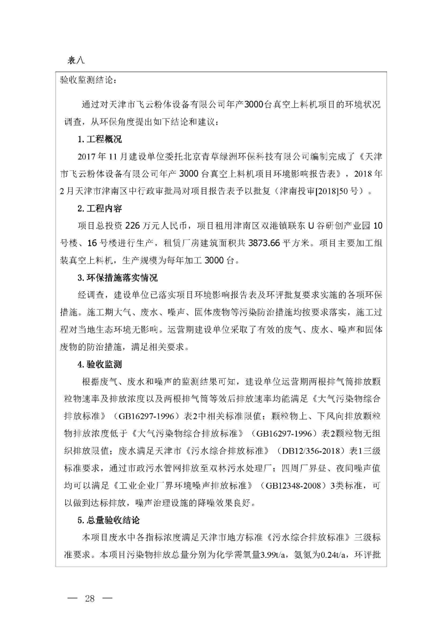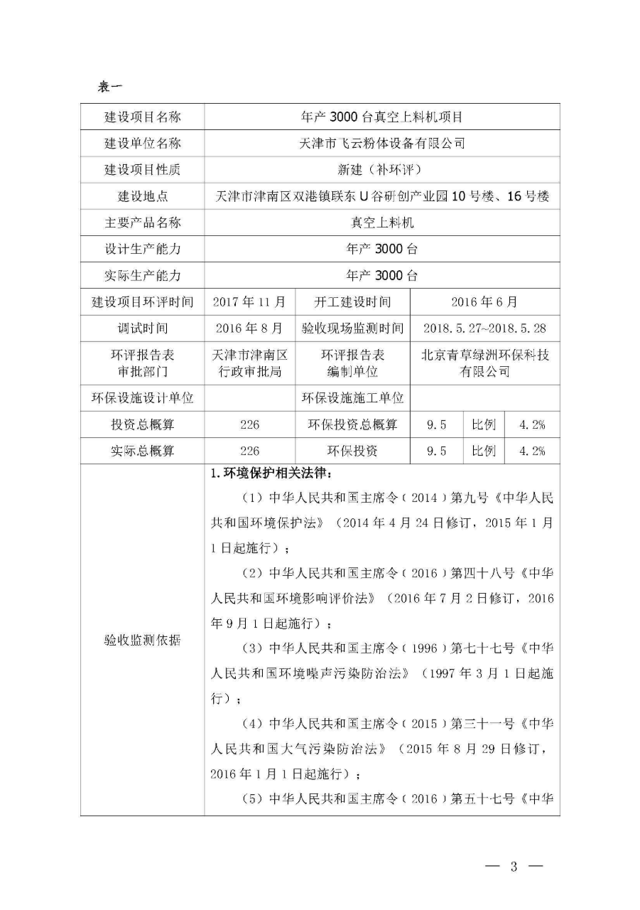 天津市飞云粉体设备有限公司年产 3000 台真空上料机项目竣工环境保护 验收监测报告表