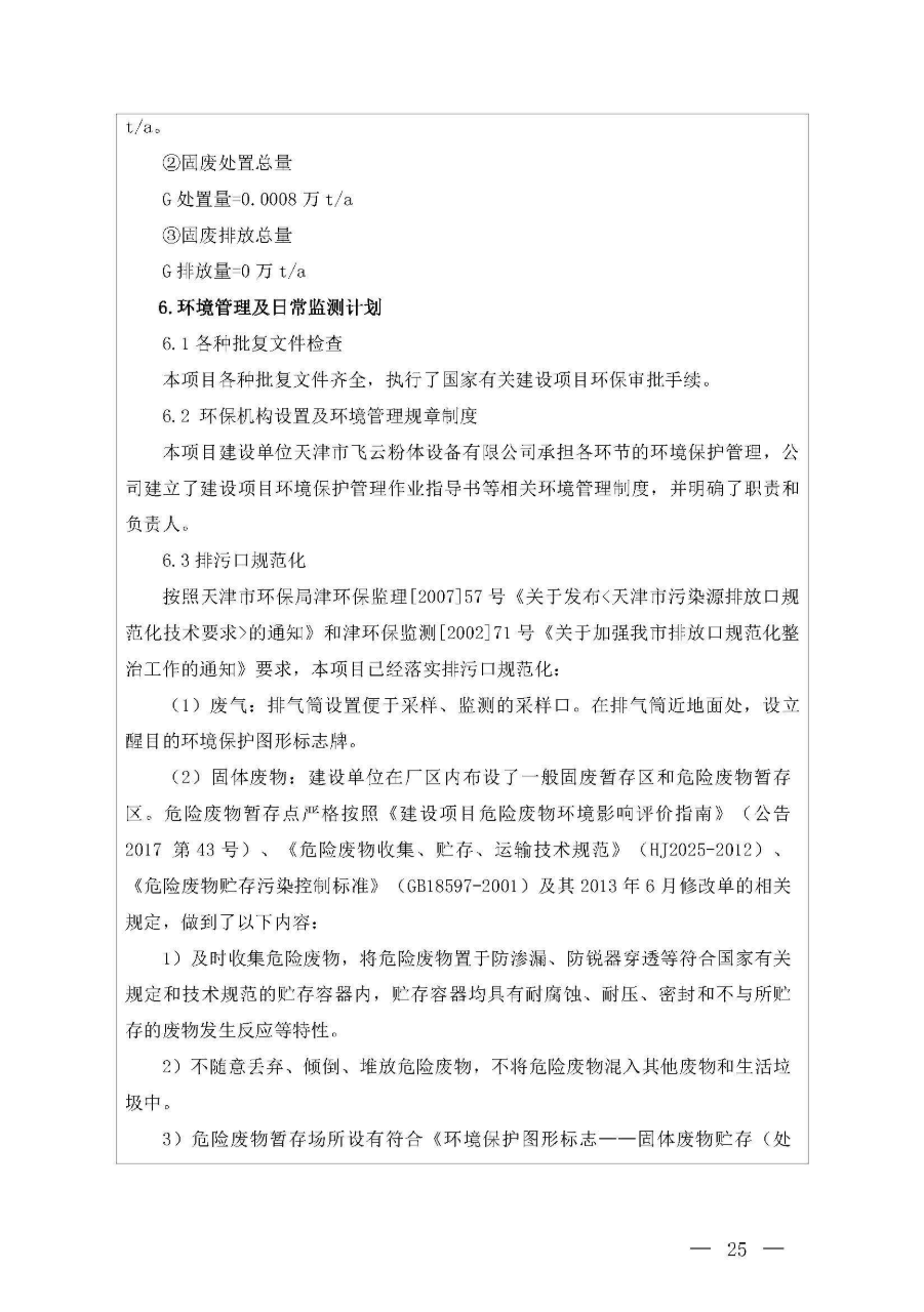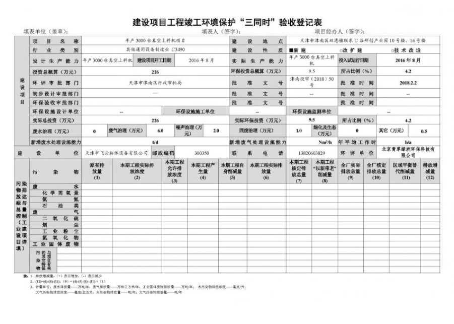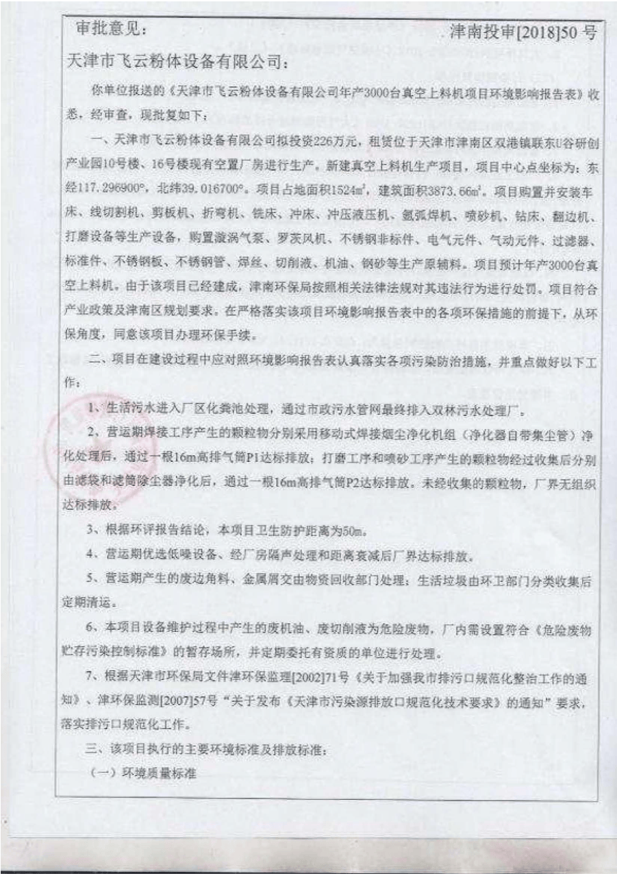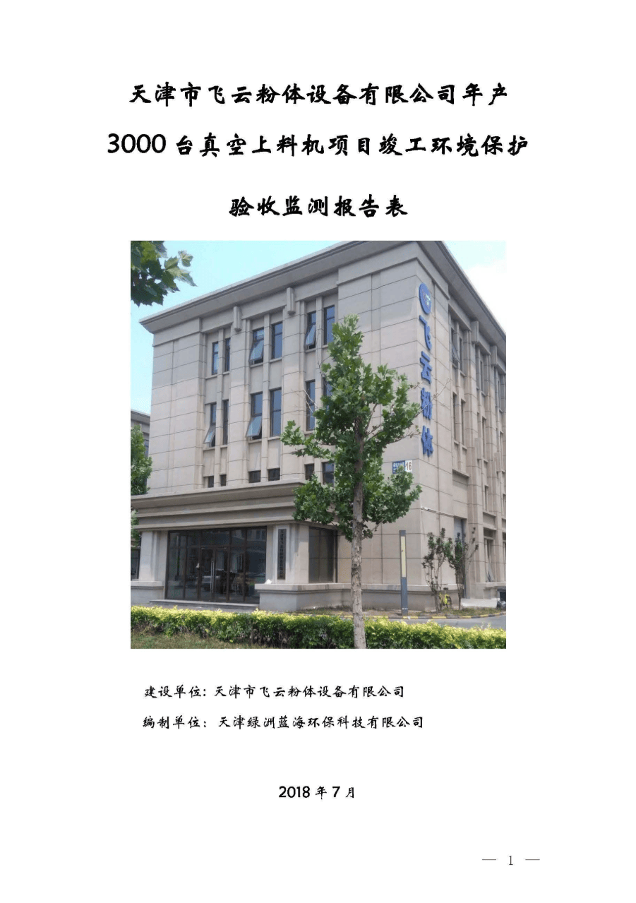 天津市飞云粉体设备有限公司年产 3000 台真空上料机项目竣工环境保护 验收监测报告表